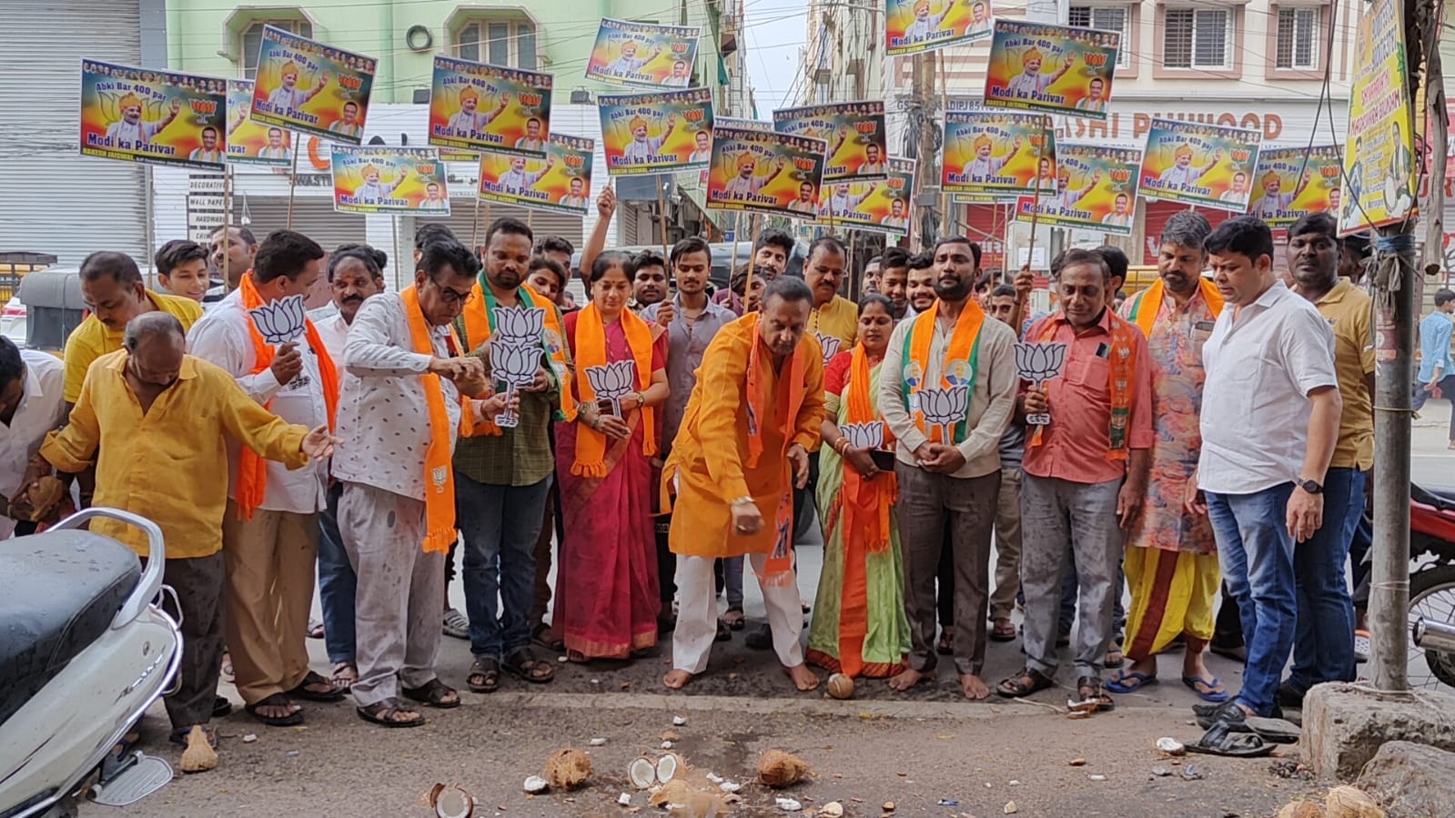 Hyderabad,BJP's senior leader and Jambagh division corporator Mr Rakesh Jaiswal Hyderabad along with the BJP karyakartas offered their prayers for AB KI BAAR 400 PAAR to the BJP and NDA parties in Parliament results and offered 108 coconuts broken at Hindi Nagar Ram Mandir for Modi ji leadership and his good health, Anil Yadav, Kajal , Raghu, Sandeep, Narsing